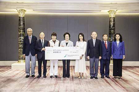 支票遞交儀式昨天於澳門上葡京綜合度假村舉行,澳娛綜合常務董事何超鳳女士、董事兼員工福利諮詢委員會主席梁安琪女士將善款支票交予澳門日報讀者公益基金會,由賀定一會長、黃國勝理事長、陸波副會長、許建章副會長、吳柱邦監事長及何凱玲常務副理事長代表接收。