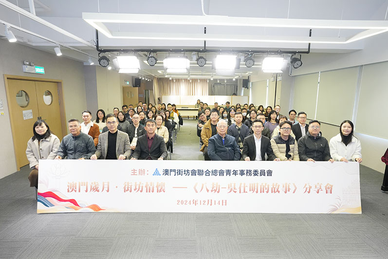 【特訊】日前,澳門街坊會聯合總會青年事務委員會舉辦“澳門歲月·街坊情懷---《八劫-吳仕明的故事》分享會”,邀請街坊總會榮譽會長吳仕明擔任主講嘉賓,向青年分享其在街坊總會參與社會服務的經歷和人生感悟,鼓勵青年勇於接受挑戰,發揚和傳承街坊會愛國愛澳、無私奉獻的精神,積極參與社會。出席嘉賓包括中聯辦社工部處長羅振宇、街坊總會副會長兼立法會議員何潤生、副會長兼秘書長莫偉成、副理事長兼立法會議員顏奕恆、副理事長鄧文基、林焯佳等。
