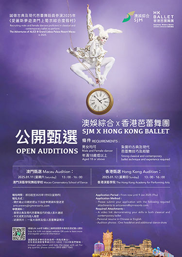 【特訊】澳娛綜合度假股份有限公司(「澳娛綜合」)攜手享譽國際的香港芭蕾舞團,誠邀擁有純熟舞蹈技巧、才華洋溢的男女古典芭蕾或當代舞者參加2025年全新駐場演出《愛麗斯夢遊澳門上葡京綜合度假村》的公開甄選。在資深藝術團隊的指導下,經典故事將以嶄新的視角呈現,結合富故事性的編舞、美輪美奐的服裝、以及引人入勝的舞台特效。入選舞者將獲簽短期演出合約,並在精彩演出中擔當重要角色,為不同年齡的觀眾帶來全新體驗。
