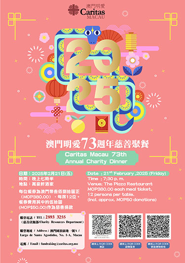 【特訊】「澳門明愛七十三周年慈善聚餐」訂於2025年2月21日(星期五)晚上七時半假萬豪軒酒家舉行。慈善聚餐目的是讓善長們可聚首一堂,攜同親友、員工一起,共渡一個有意義的晚上,同時活動亦為澳門明愛籌募慈善服務經費。席間將設有豐富表演節目及禮物抽獎,同時會設有隨緣樂助捐款環節,讓參加者自由捐獻。餐券每張為澳門幣380元(其中澳門幣50元作為慈善捐款),歡迎踴躍支持,如欲購買餐券,可透過海報上的二維碼直接購買,或致電2893 3255與澳門明愛慈善資源部聯絡。為善最樂,福有攸歸!