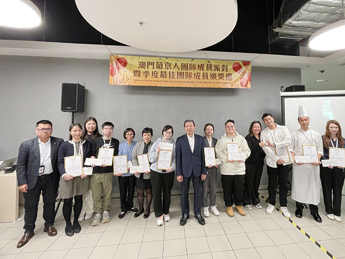 在喜慶的氣氛中,榮獲2024年第四季度「最佳團隊成員」的分別是(排名不分先後):蔡子盈(採購部)、鄧惠棠(管家部)、梁揚本(管家部)(代領)、劉淑賢(前堂部)、蘇倩茹(前堂部)、朱杰明(餐飲部)、謝雪盈(餐飲部)、楊嘉頴(市場推廣及零售發展部)、馬力鈞(市場推廣及零售發展部)、陳翠怡(銷售及企業傳訊部),並由澳門葡京人酒店營運總經理鄭文良先生(右七)向得獎團隊成員頒發獎狀,感謝成員的付出和努力,一眾公司管理層與最佳團隊成員合照留念。