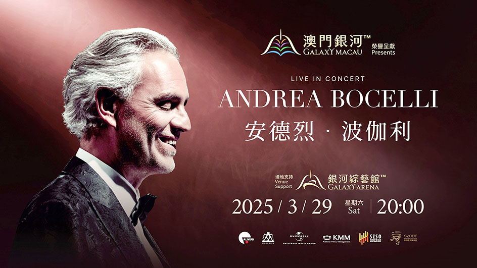 「澳門銀河™」榮譽呈獻: ANDREA BOCELLI Live in Concert,時間: 2025 年 3 月 29 日, 晚上 8 時,地點:銀河綜藝館,主辦單位:新銀娛藝萃文化有限公司。