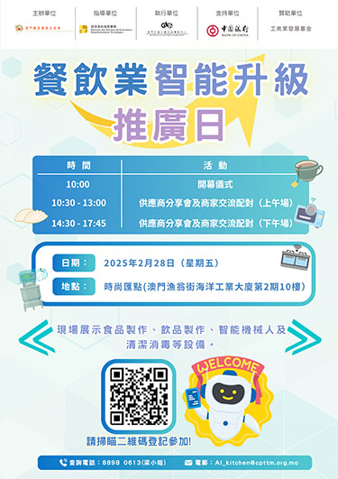 【特訊】為推動澳門餐飲業利用科技或智能化設備升級轉型,由澳門餐飲業聯合商會主辦、經濟及科技發展局指導、澳門生産力暨科技轉移中心執行的“餐飲業智能升級推廣日”,將於2月28日在澳門生產力中心時尚匯點舉行。現場將展示多款智能設備及餐飲解決方案,並安排商業配對洽談,助力中小企業提升營運效率及競爭力。