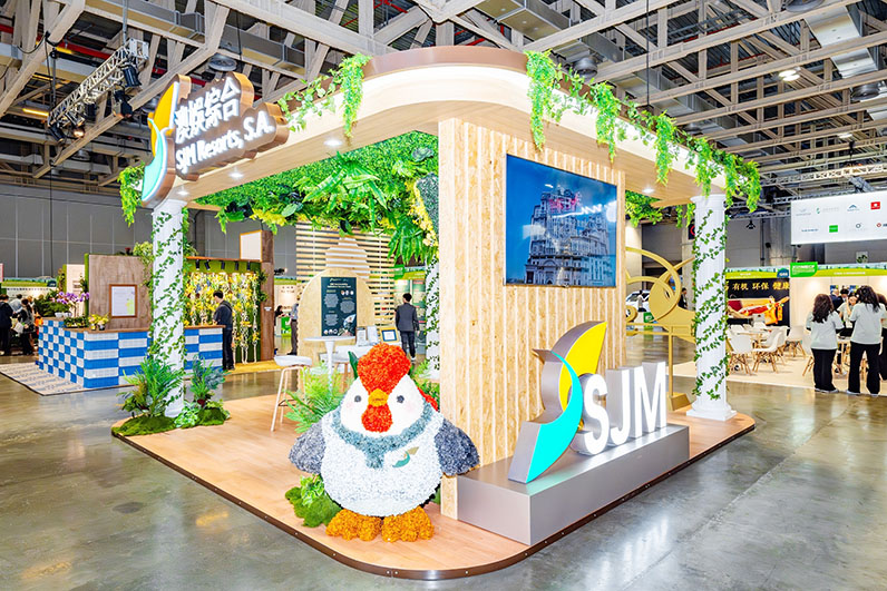 澳娛綜合以一座匠心設計、融合生態美學與可持續理念的展位參展,凸顯集團的環保承諾。展台設計靈感取材於自然,採用再生物料與節能照明系統,搭配精心設計的造景及澳娛綜合吉祥物「花藝師森仔」,展出集團在水資源保育、能源優化及綠色營運的創新實踐。例如在澳門上葡京綜合度假村安裝近 70 個水龍頭流量調節器,每個水龍頭每分鐘能節省約 7 升用水;在澳門新葡京酒店使用了地下水作非飲用水用途,實現替代水源的有效利用;並於旗下物業使用 LED 燈具, 減少資源耗損。是次展台更透過支持符合國際核證減排標準(Verified Carbon Standard)的風電項目,成功獲取碳中和會展及活動標籤。