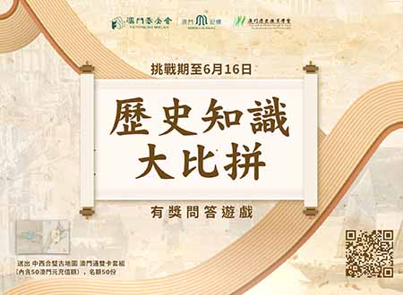 【特訊】由澳門基金會及其歷史文化工作委員會、澳門歷史教育學會與澳門廣播電視股份有限公司聯合主辦,教育及青年發展局和文化局支持的第六屆“澳門中學生歷史知識競賽”決賽將於2025年5月18日(星期日)假濠江中學附屬英才學校舉行。為配合此次賽事的舉行,並進一步提升市民對中華歷史文化的興趣、增強對本地歷史的了解,以及推廣歷史文化教育,澳門基金會與澳門歷史教育學會攜手在“澳門記憶”文史網推出“歷史知識大比拼”有獎線上問答遊戲。