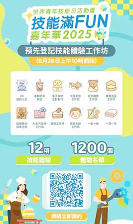 【特訊】為響應“世界青年技能日”,勞工事務局及澳門青年發展服務中心合辦、澳門中華新青年協會協辦“世界青年技能日活動暨技能滿FUN嘉年華2025”活動,活動將於7月5日至6日在氹仔星皓廣場舉辦,預先登記期由6月26日10時開始至7月3日下午1時截止,名額有限,先到先得,歡迎市民踴躍參加。