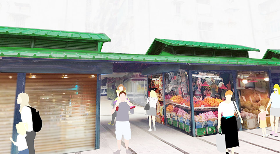 此外,擴闊小販檔和兩邊住宅的距離,小販檔與吉祥樓的距離由目前的五米增至六米,與另一側的順利樓也保持六米距離,提升防火安全;四檔一組的小販檔呈「田」字形排列,每檔均兩面單邊,每組之間通道由現時的一米拓寬至兩米,優化行人通道並有利防火;小販區路面由原水泥地改為拼色地磚,南側將設置休閒小廣場,增加綠植及座椅,為區內居民提供休閒空間,亦有助提升小販區聚集人流。