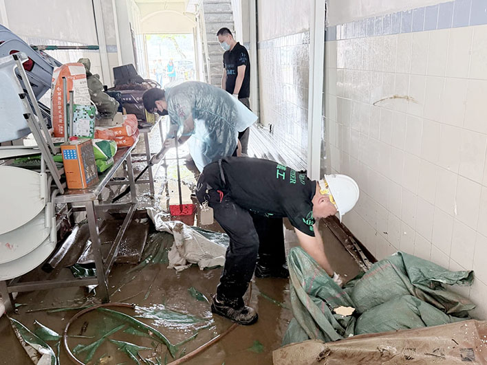 南區:新濠與澳門工會聯合總會(「工聯總會」)攜手合作,動員30名義工協助受嚴重水浸影響的居民及中小企,搬回散亂的物品,清理垃圾和雜物,並恢復該區的安全及清潔環境。