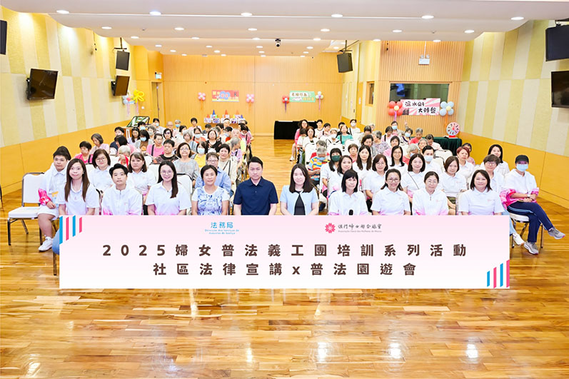 【特訊】由法務局與婦聯總會合辦的“二〇二五婦女普法義工團培訓系列活動——社區法律宣講及普法園遊會”,日前在渡船街婦聯綜合服務大樓五樓何賢禮堂順利舉行,吸引逾一百名市民踴躍參與,現場氣氛熱烈。出席活動嘉賓包括法務局法律推廣及公共關係廳廳長陳志揚、高級技術員王珮珊,及婦聯教育培訓中心主任關艷娟等。