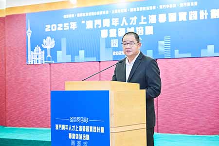 【特訊】由全國政協港澳台僑委員會、上海市政協、澳區全國政協委員、中央人民政府駐澳聯絡辦公室、澳門基金會主辦的2025年“澳門青年人才上海學習實踐計劃”專業領域培訓已於10月17日下午3時於澳門中華總商會四樓何賢先生紀念堂舉行開班儀式。20名來自本澳社會各界的學員將於10月19日至12月18日赴上海區級政府相關部門或企事業單位進行兩個月實踐活動,期間輔以理論課程及參觀考察增進知識。