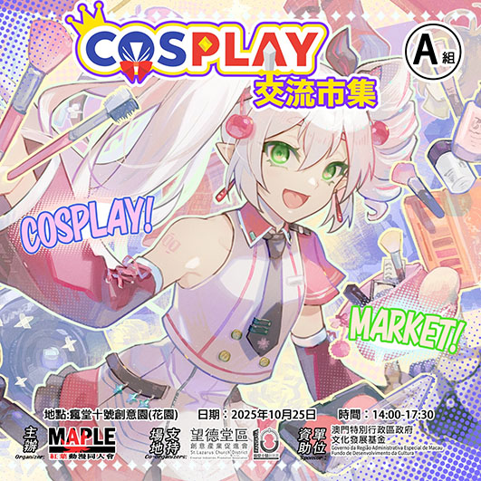 【特訊】Cosplay交流市集2025將於2025年10月25日(六)下午二時至五時三十分假瘋堂10號創意園舉行,活動由紅葉動漫同人會主辦,資助單位為澳門特別行政區政府文化發展基金。