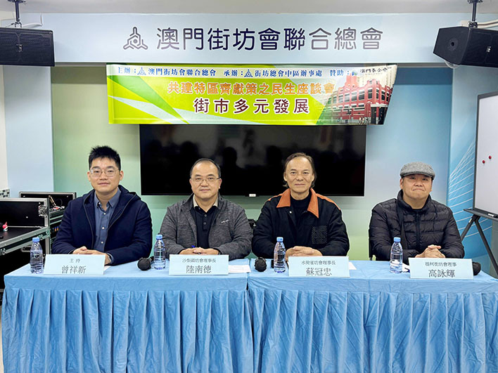 【特訊】街坊總會日前在街總中區辦禮堂舉行“共建特區齊獻策之民生座談會-街市多元發展”座談,邀請沙梨頭坊會理事長陸南德、水荷雀坊會理事長蘇冠忠、提柯街坊會理事高詠輝擔任主講嘉賓,和與會者共同探討本澳街市多元發展議題並收集意見。活動獲澳門基金會贊助。