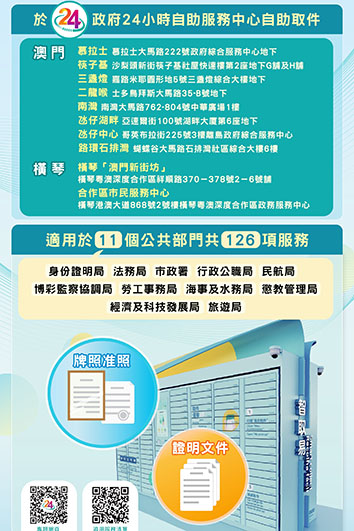 “智取易”智能文件櫃提供24小時自助取件服務,方便市民、商企和社團在申請政府文件後,於澳門和橫琴合作區各政府24小時自助服務中心的文件櫃取件,不受部門辦公時間限制。