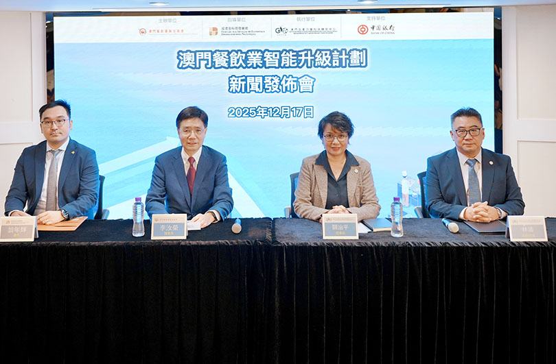 澳門餐飲業聯合商會推出「澳門餐飲業智能升級計劃」,並委託澳門生產力暨科技轉移中心作為執行單位。該計劃發佈會昨日舉行,澳門餐飲業聯合商會理事長李汝榮、指導單位經濟及科技發展局廳長翁年輝、執行單位生產力中心理事長關治平,以及支持單位中國銀行(澳門)股份有限公司普惠金融部主管馮振星等出席。