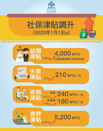 社會保障制度作為居民全生命周期的基本保障,出於對居民在面臨重要人生節點的關懷,以及在面對突發狀況時的支援,自2026年1月1日起調升四項津貼的金額。調升後,結婚津貼由原來2,220元(澳門元,下同)調升至4,000元,合資格配偶雙方可同時申請,失業津貼調升至210元/日、疾病津貼方面,住院津貼調升至240元/日,非住院津貼調升至180元/日、喪葬津貼調升至5,200元。