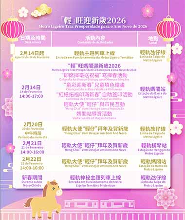 「『輕』旺媽閣迎新歲」將於2月14日下午2時至5時假輕軌媽閣站(A出入口)舉行,輕軌公司將邀請多位書法愛好者現場即席揮毫,為大家送上寓意吉祥的揮春,參加者亦可親自書寫揮春,為新春添福增彩。活動還設有填色繪畫創作體驗,並提供多款精心設計的賀年印章,讓家長與小朋友攜手發揮創意,共度溫馨的親子時光。活動當天亦將舉辦兩場媽閣站導賞活動,有興趣市民可瀏覽輕軌公司網站了解詳情及報名。