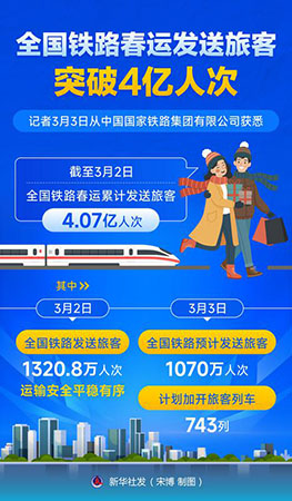 【新華社北京3月3日電】(記者樊曦)記者3日從中國國家鐵路集團有限公司獲悉,截至3月2日,全國鐵路春運累計發送旅客4.07億人次。其中,3月2日,全國鐵路發送旅客1320.8萬人次,運輸安全平穩有序。3月3日,全國鐵路預計發送旅客1070萬人次,計畫加開旅客列車743列。