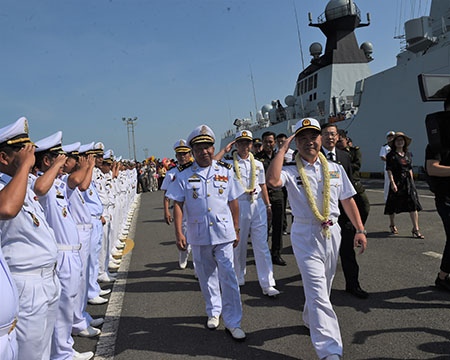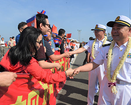 中國駐柬大使王文天率使領館館員、援柬軍事專家、柬華理事會、在柬中資機構、華僑華人代表在碼頭迎接。柬海軍雲壤基地副司令羅威斯納少將,及柬海軍官兵代表參加歡迎儀式。
