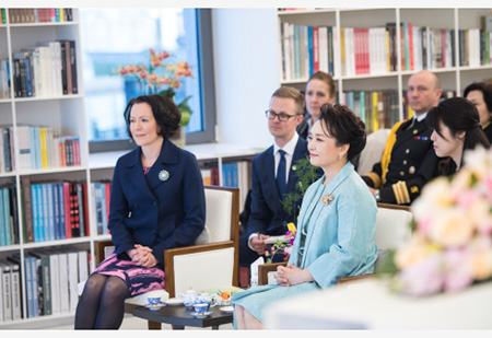 書店三層,茶藝飄香,兩國元首夫人一邊品茗,一邊欣賞由北京外國語大學和中國音樂學院師生帶來的精彩演出。芬蘭語專業學生們朗誦了由豪吉歐創作的獲獎詩歌《一月已然春天》和《我親愛的寶貝》,豪吉歐驚喜地連連稱贊。身著古裝的女生伴隨著鋼琴和古箏曲吟唱中國古詞賦《春光好》和《鳳求凰》。小提琴和鋼琴演奏芬蘭作曲家西貝柳斯的作品。詩詞歌賦音符搭起人們心靈溝通的橋樑,留下中芬友好溫馨美麗的瞬間。