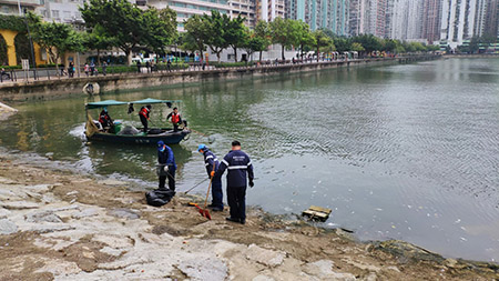 【特訊】近日海事及水務局於筷子基北灣附近海面發現死魚,隨即派員和船隻到現場加緊清理,以保持海面環境清潔。星期日至今海事局共清理了800公斤死魚,昨早(12日)筷子基海面仍有零星死魚漂出,海事及水務局繼續派員跟進清理工作。