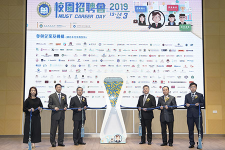 澳科大「校園招聘會2019」開幕儀式於3月13上午11時在澳科大圖書館大樓N101禮堂進行。澳科大劉良校長、中聯辦教育與青年工作部苟人民副部長、澳門特別行政區政府高等教育局陳旭偉代副局長、廣東省人力資源和社會保障廳葛國興副廳長、勞工事務局就業廳歐陽信偉職務主管、澳門統計暨普查局推廣暨資訊發表處蔡嘉儀處長等出席。大學管理層向出席的120多家機構/企業致送由畢業生設計的紀念品,場面熱鬧。