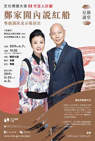 “鄭家園內說紅船—粵劇講座及示範演出”將於4月7日晚上7時30分至9時30分在鄭家大屋舉行,有興趣市民可於3月25日至4月3日期間,登入文化局網頁“活動報名系統”www.icm.gov.mo/eform/event進行網上報名,或於報名期內星期一至星期五上午9時30分至中午12時30分、下午3時至5時30分,致電8399 6662許先生或8399 6471楊小姐報名。講座以粵語進行,名額有限,如報名人數多於名額上限,將以電腦抽籤進行錄取,獲錄取者將收到短訊通知。更多資訊可瀏覽網頁www.icm.gov.mo/pec。