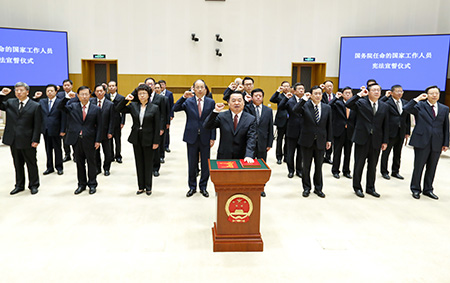 根據《中華人民共和國憲法》和《國務院及其各部門任命的國家工作人員憲法宣誓組織辦法》,2018年11月至2019年6月國務院任命的25個部門和單位的28名負責人依法進行憲法宣誓。上午11時,中國國務委員兼國務院秘書長蕭捷宣佈憲法宣誓儀式開始。全體起立,唱中華人民共和國國歌。隨後,領誓人手撫憲法,領誦誓詞,其他宣誓人在後方列隊站立,跟誦誓詞。