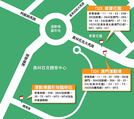 12條途經澳門運動場的巴士路線包括:11、22、25B、26、26A、28A、30、33、34、MT1、MT3、MT4,於球賽開始前及結束後,預計合共增加約180個班次,其中配合球賽結束後的搭乘需求,MT3路線將提供特班車服務。