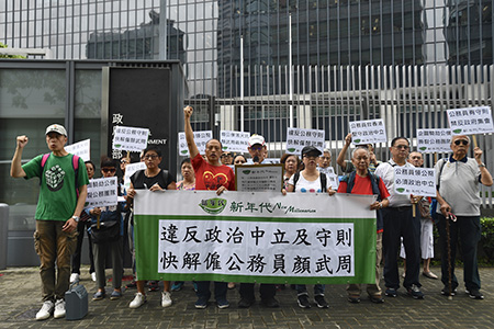 【香港中通社8月2日電】(記者 黎金良)香港民間團體“新年代”8月2日上午從金鐘港鐵站遊行至政府總部,抗議公務員顏武周等人發起公務員集會。該團體認為,這違反公務員政治中立的守則,特區政府有關部門應將其解僱。