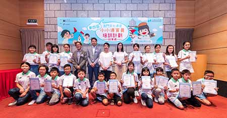 「澳門文化遺產小小導賞員培訓計劃」已連續四年於暑假期間舉辦,活動舉辦至今一直得到學員、家長及社會各界的認可和正面評價,並已培訓逾百名的小小導賞員。第四屆培訓活動已於七月二日至三十日期間順利舉行,廿六名學員經過一個月的培訓,最後通過考核正式成為澳門文化遺產小小導賞員。文化局代局長梁惠敏在結業典禮上致辭時表示,青少年是社會未來的主人翁及棟樑,是社會可持續發展的動力,肩負起承傳和發揚中華文化的責任,為此,文化局冀望透過每年舉辦不同類型的青少年活動,培養其探索歷史文化的興趣,主動發掘澳門歷史文化的內涵和價值,共同保護和傳播本地和中華文化。