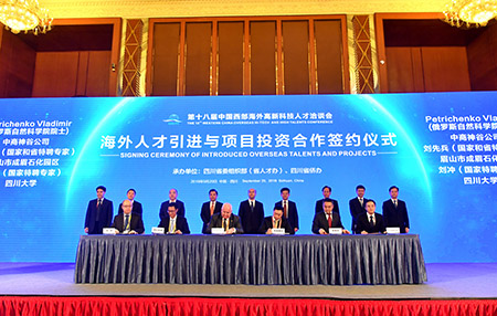【中新社成都9月20日電】(王鵬)記者20日從第十八屆中國西部海外高新科技人才洽談會(簡稱“海科會”)海外人才引進暨項目投資合作簽約儀式上瞭解到,本屆“海科會”共成功簽約項目74個,簽約資金488.13億元(人民幣,下同),615名海外人才來川發展。