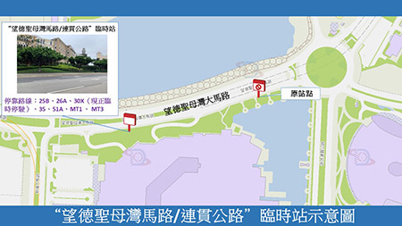 另外,由4月14日(周二)首班車起,「望德聖母灣馬路/連貫公路」巴士站往輕軌排角站方向將臨時遷移約260米,供25B、26A、30X(現正臨時停駛)、35、51A、MT1及MT3路線巴士停靠,直至工程結束。
