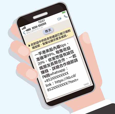 【特訊】近日不少居民收到聲稱「有一手股票內幕消息」的短訊,要求找人「合資」。司警昨發出警情通告,指經評估該短訊很有可能是投資騙局,提醒須加強警惕。