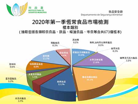為保障消費者的食用安全,市政署依據目前流通市場的食品種類和特點,制定各類型的食品調查抽樣計劃,包括“常規食品調查”及“食肆食品調查”計劃。抽樣調查的範圍包括本澳各區之超級市場、雜貨店、百貨公司、飲食場所、外賣店等,並抽取各類即食食品、飲品、糧油食品、零食等。本年第一季合共抽取六百七十三個樣本進行化學、微生物學及輻射水平等檢驗,整體合格率99.6%。