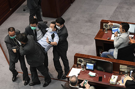 今年5月8日下午,立法會內務委員會(內委會)舉行特別會議,反對派議員暴力包圍衝擊主席台,試圖阻礙內委會主席李慧琼主持會議,處理因主席選舉過度延誤而積壓的工作。對峙期間,多名反對派議員持續推撞、拉扯、侮辱保護李慧琼的建制派議員和保安人員。