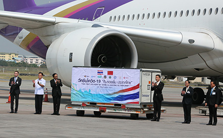 【中新社曼谷2月24日電】(記者 王國安)泰國政府採購的首批中國科興公司新冠疫苗24日運抵曼谷素萬納普機場。泰國總理巴育、副總理兼衛生部長阿努廷、中國駐泰國大使館臨時代辦楊欣等共同前往機場,迎接中國疫苗的到來。