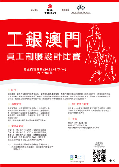 【特訊】由中國工商銀行(澳門)股份有限公司主辦、澳門生產力暨科技轉移中心協辦的「工銀澳門員工制服設計比賽」現接受報名投稿,截止交稿日期為6月7日晚上9時,歡迎年滿18歲的本澳居民參加。