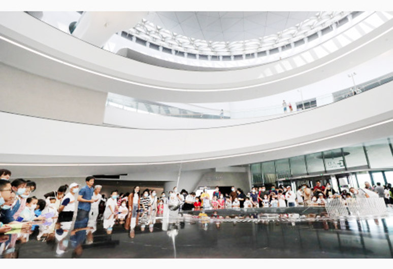 該館坐落於中國(上海)自由貿易試驗區臨港新片區,建築面積約3.8萬平方米,涵蓋“家園”“宇宙”“征程”三大主題展區及“中華問天”“好奇星球”“航向火星”等特色展區,以及8K超高清多功能球幕影院、星聞會客廳、望舒天文台、羲和太陽塔與星空探索營,全景展現宇宙浩瀚圖景。在開館儀式上,國家航天局提供的由嫦娥五號帶回地球的月球土壤樣品,被封裝在水晶球中,也正式入駐上海天文館“征程”展區。據澎湃新聞消息,7月18日上海天文館對公眾開放當日,7月18日至24日的門票已全部預約完。據館方透露,夏季上海科技館“旗下”科技館、自博館、天文館三大館區都大熱,行程需要提前規劃。
