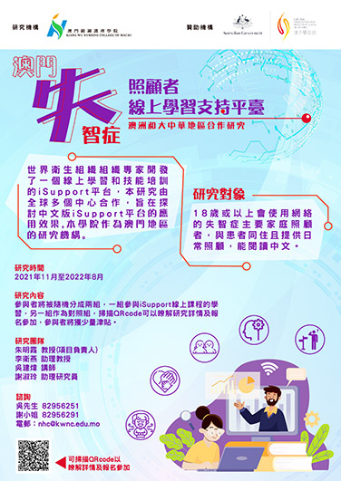 她提到,有關研究受澳洲政府澳中基金會資助,透過全球多個地區的合作研究,為世界衛生組織(WHO)開發的線上學習和技能培訓平台探索最佳的應用效果,並供失智症照顧者使用。澳門地區的研究由澳門鏡湖護理學院進行,與澳洲佛林德斯大學(Flinders University)、北京大學、香港中文大學及台北醫學大學等共九所高等院校及研究機構合作。