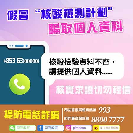 【特訊】司法警察局前天(廿五)日接獲市民反映,稱收到來電顯示為+853開頭的陌生電話,對方自稱為新型冠狀病毒核酸檢測工作人員,指事主的檢測登記資料不足,要求事主提供個人身份資料。事主認為其電話號碼可疑,懷疑對方假冒政府檢疫人員行騙,故拒絕提供資料並立即掛線。