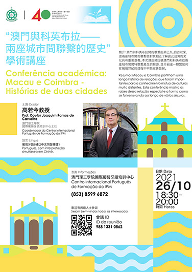 「澳門與科英布拉—兩座城市間聯繫的歷史」 學術講座將於澳門當地時間10月26日18時30分透過線上方式進行,現誠摯歡迎各界人士掃描海報二維碼報名參與。本場講座以葡語進行,提供中文同聲傳譯,費用全免。如有垂詢,敬請致電澳門理工學院國際葡萄牙語培訓中心8599 6872。