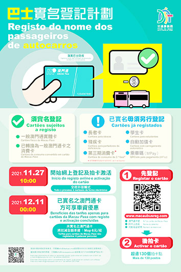 今年12月11日零時起,澳門通卡須經實名登記後方可享有車資優惠。登記計劃採用全程非接觸式的「先網上登記、後拍卡激活」方式,登記後可即時拍卡激活。交通事務局呼籲市民配合防疫工作,儘早登入網上登記平台 www.macaubusreg.com 填寫資料登記,並持卡前往全澳超過130個拍卡點拍卡激活,但長者卡、學生卡、殘疾卡、自動加值卡、第三期消費卡(消費卡使用期維持至2021年12月31日)及乘車碼(MPay),已具條件聯繫乘車人可毋須另行登記及拍卡。