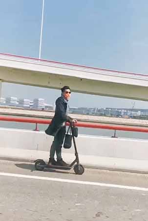 【特訊】一名男外僱使用電動滑板車於友誼大橋行駛,治安警已將有關男子截獲,涉事男子涉嫌觸犯道路交通法和友誼大橋規章,被警方檢控及教育。治安警呼籲駕駛者及行人遵守交通規則,如使用非合法載具誤闖大橋或專道可被科處罰款。