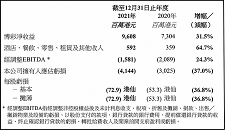 ․本公司之附屬公司澳娛綜合度假股份有限公司(「澳娛綜合」)於2021年的博彩淨收益為96.08億港元,而2020年則為73.04億港元。