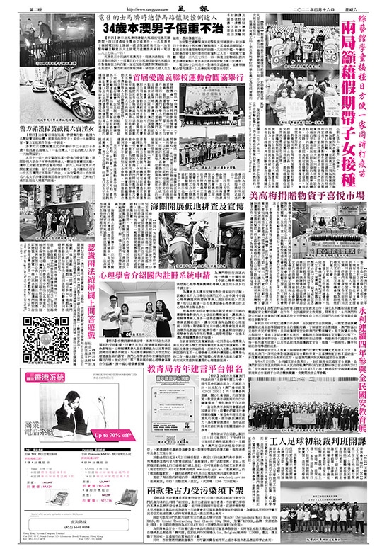 【特訊】市政署獲悉香港食物安全中心公佈,指再有兩款可能受沙門氏菌污染的比利時“KINDER”朱古力產品曾進口香港。市政署已即時向本澳食品業界發出食品預警,並同時派員到市面巡查,經初步瞭解暫未見涉事批次產品在本澳銷售。市政署會密切留意事態發展並持續跟進,為審慎起見同時呼籲市民若從其他途徑購入或持有涉事產品,應立即停止食用。