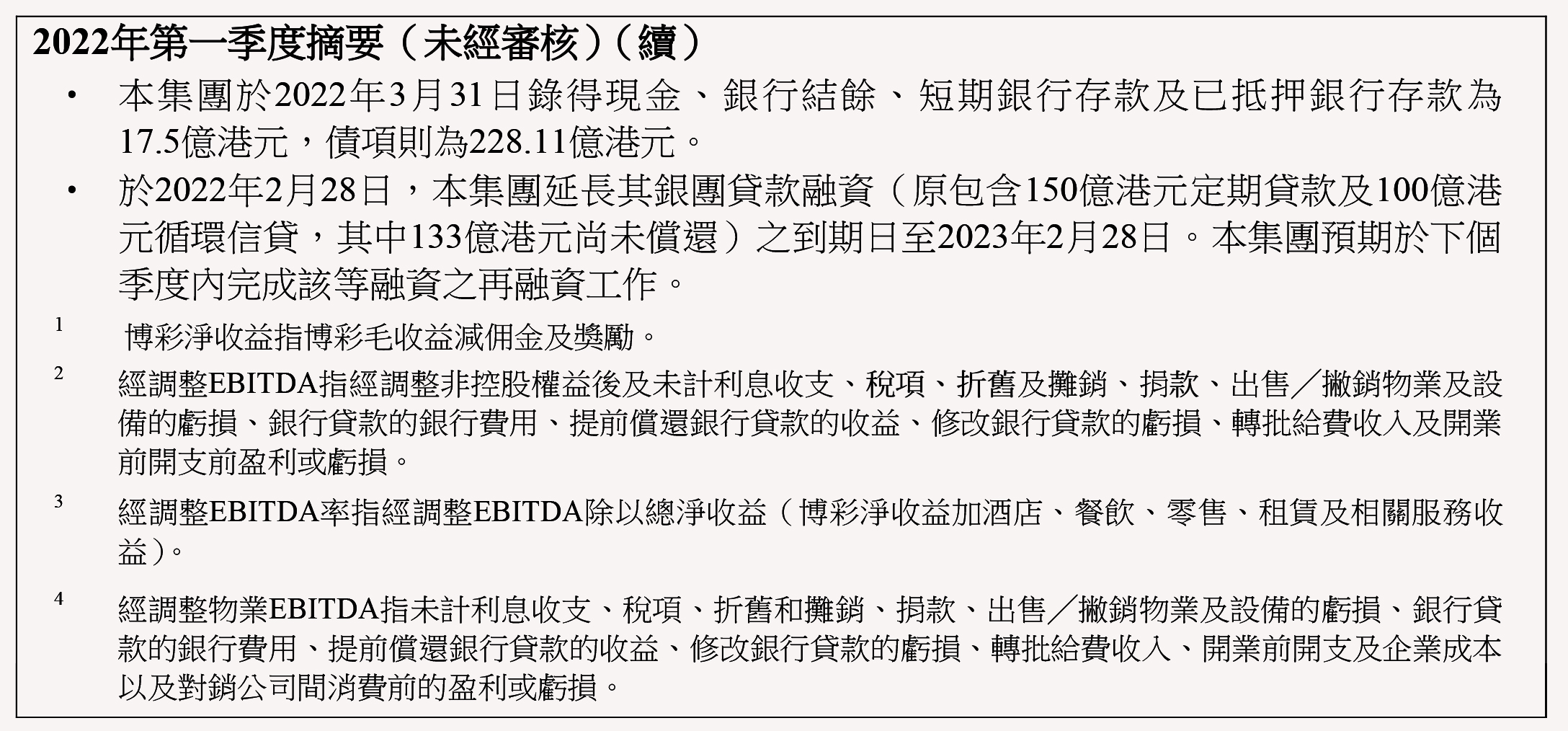 本公司之附屬公司澳娛綜合度假股份有限公司於2022年第一季度的博彩收益減去佣金及獎勵的1.91億港元後(2021年第一季度為2.40億港元)為23.5億港元,較2021年第一季度減少2.6%。