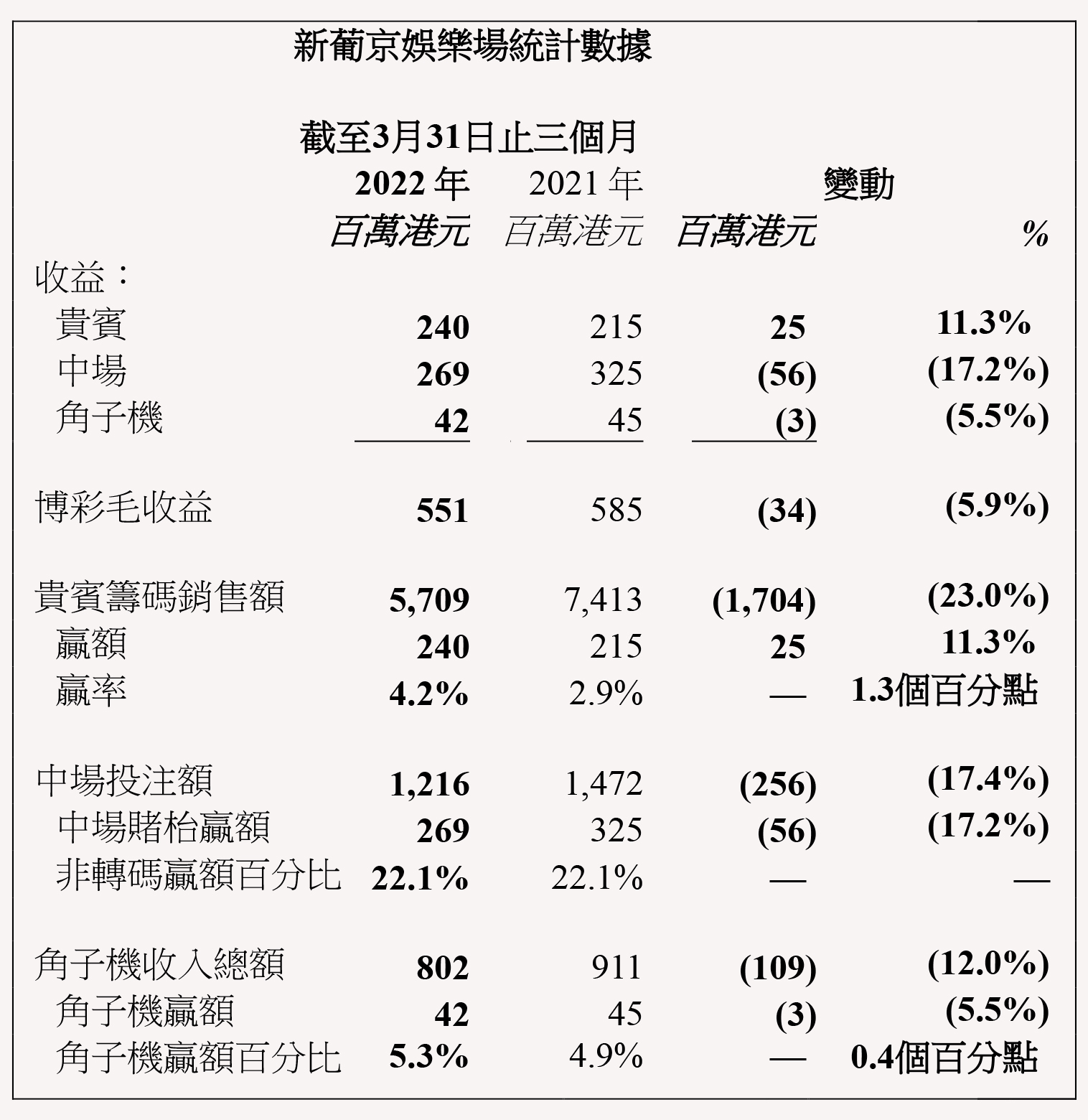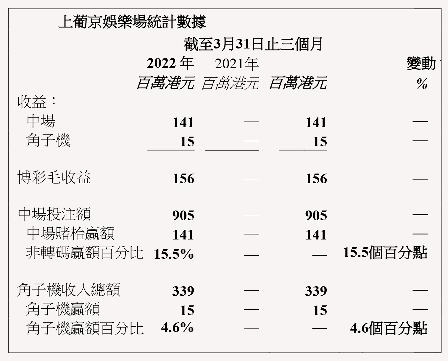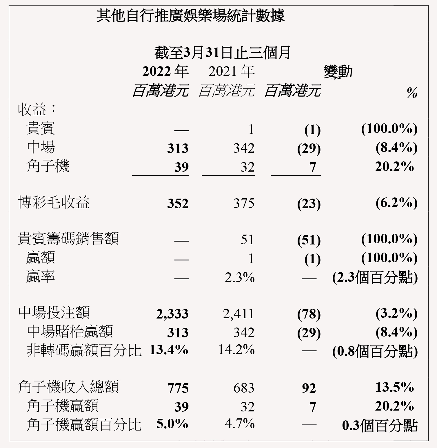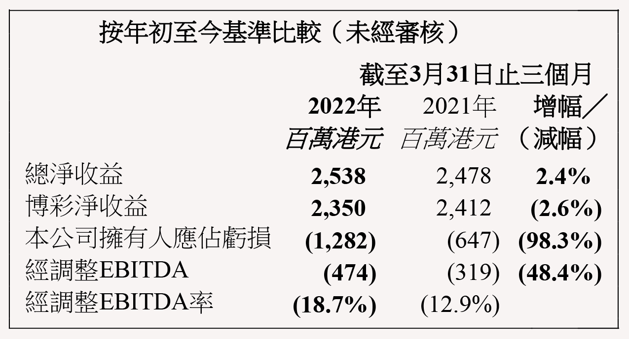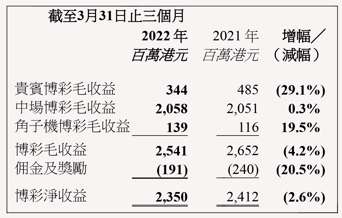 本集團之貴賓博彩毛收益於2022年第一季度為3.44億港元,較2021年第一季度之4.85億港元減少29.1%;中場博彩毛收益為20.58億港元,較去年同期之20.51億港元增加0.3%;角子機博彩毛收益為1.39億港元,較去年同期之1.16億港元增加19.5%。