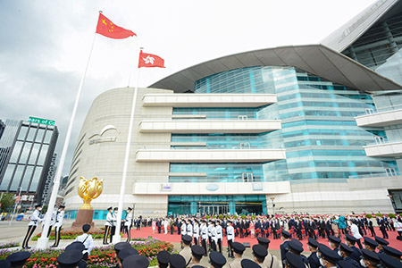兩面鮮艶的旗幟升至旗桿頂點,在風中飄揚。特區政府紀律部隊在空中和海上敬禮,多架直升機懸挂著國旗和區旗在維多利亞港上空飛過;海面上,船隻噴灑出巨大的水花。