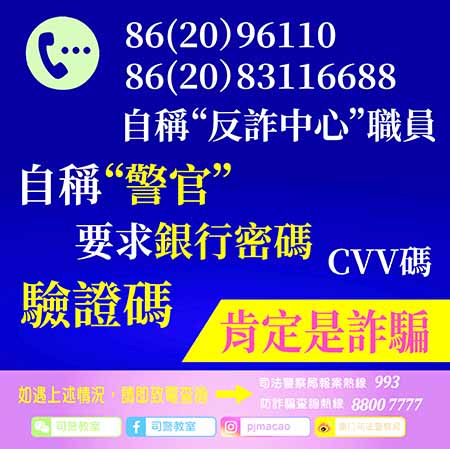 鑑於假冒政府部門或機構的電話詐騙案件時有出現,騙徒作案手法多變,司警局呼籲市民須時刻保持警惕,慎防不法之徒伺機套取個人資料或詐騙金錢。任何司法機關和警察機關均不會“線上辦案”,也不存在所謂“安全帳戶”及“資金審查”,倘接獲類似的電話,應立即掛線。
