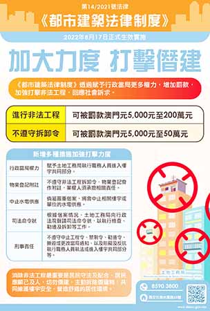 【特訊】土地工務局表示,《都市建築法律制度》於二○二二年八月十七日正式生效實施。制度旨在配合澳門社會和建築業的迅速發展,訂定更配合社會現狀及建築發展趨勢的規範和相關程序,並加強對違規事項的監管力度,以便在保障公共利益的同時,更好地回應社會的實際需要。總體而言,新法主要優化審批工程計劃、發出工程准照程序,及對樓宇的維修保養、非法工程的監管等方面訂定明確的處理措施和相應的處罰程序。
